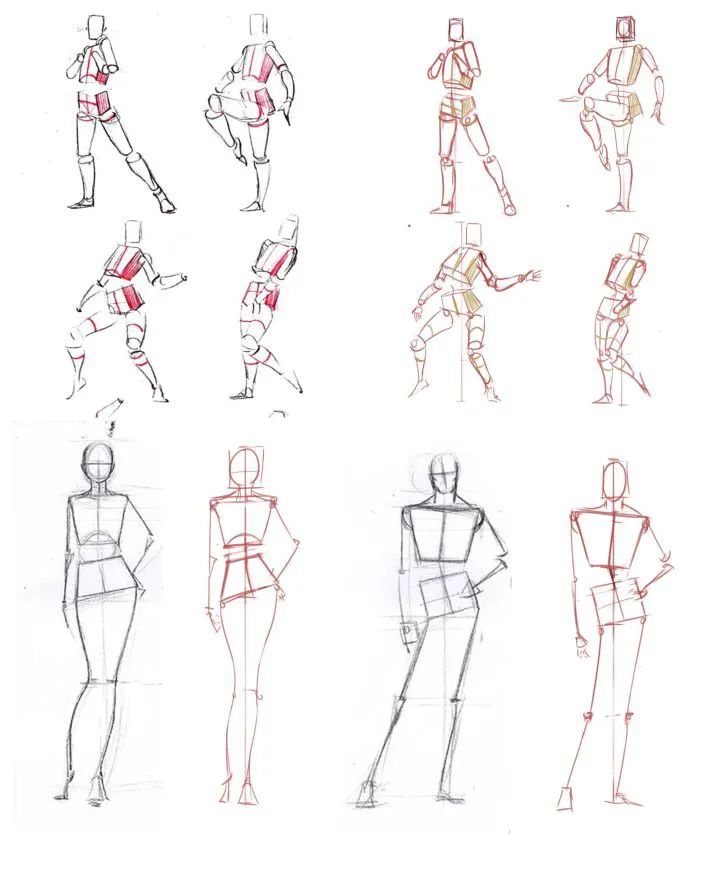 其次,把人体看成一个平面的长方形,胯部处于长方形的1/2处。最后,把整个人体看成一个圆柱体。